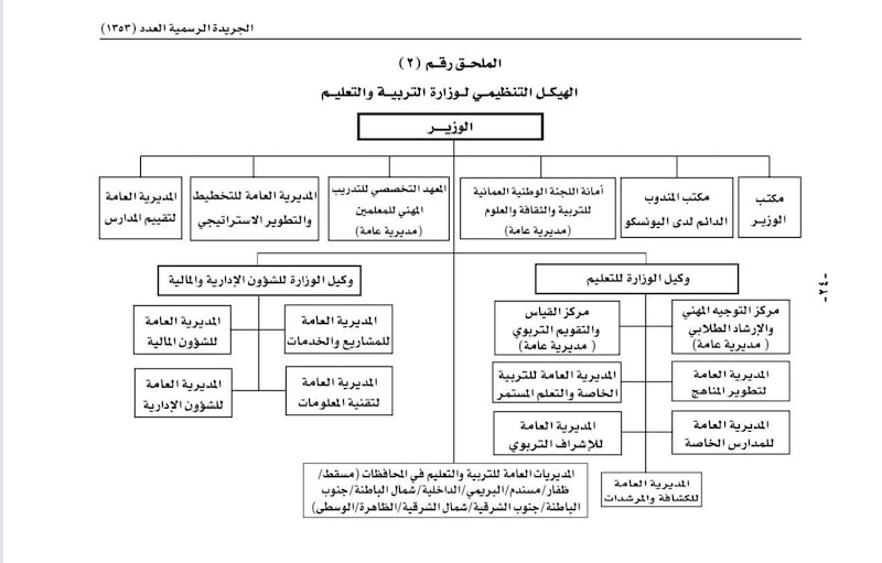نشرت الجريدة الرسمية اليوم تفاصيل المرسوم السلطاني رقم 79 / 2020 القاضي بتحدد اختصاصات وزارة التربية والتعليم، واعتماد هيكلها التنظيمي.