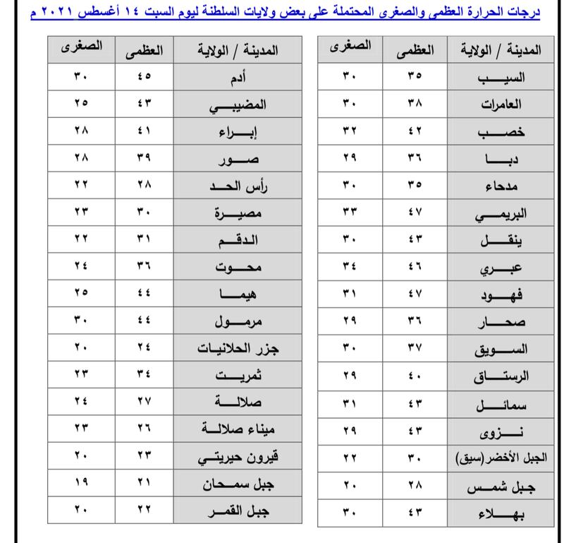 سيكون طقس اليوم السبت غائما جزئيا إلى غائم على الشريط الساحلي لمحافظة ظفار والجبال المجاورة مع تساقط الرذاذ المتقطع، وصحوا بوجه عام على بقية محافظات السلطنة مع احتمال تشكل السحب الركامية على جبال الحجر قد تؤدي لهطولأمطار رعدية متفرقة خلال المساء واحتمال تشكل السحب المنخفضة أو الضباب اخر الليل والصباح الباكر على سواحل بحر العرب وبحرعمان.
