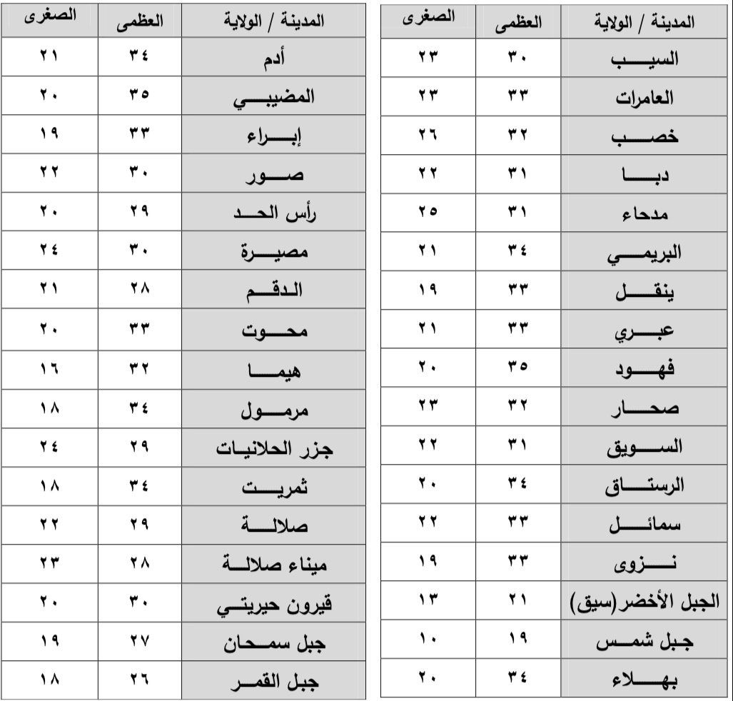 وفيما يلي درجات الحرارة في بعض ولايات السلطنة: