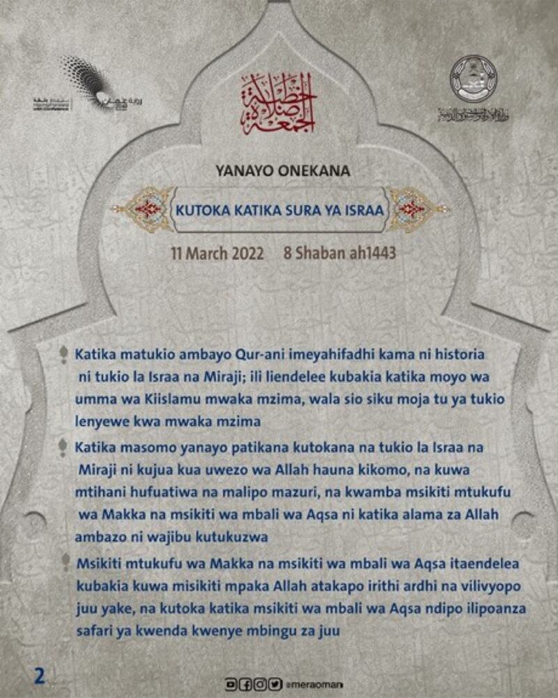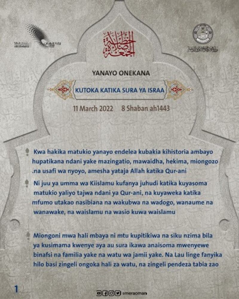 نشرت وزارة الأوقاف والشؤون الدينية اليوم مقتطفات من خطبة الجمعة التي جاءت بعنوان “تجليات من سورة الإسراء”.