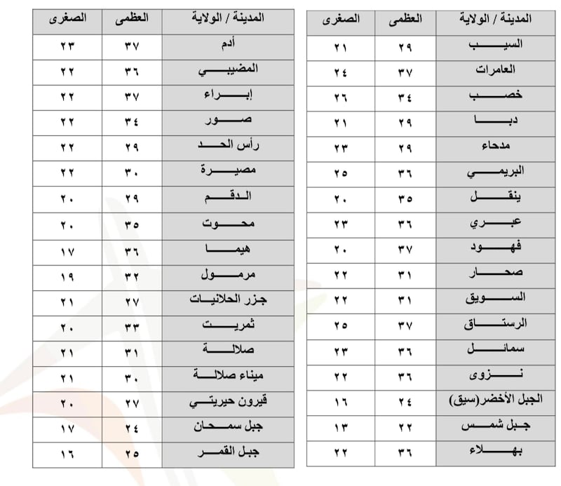فيما تبلغ درجات الحرارة في ولاية السيب 29 / 21 وفي ولاية صلالة 31/ 21، وأعلى درجة حرارة متوقعة اليوم 37 درجة في العامرات وفهود والرستاق وأدم وإبراء وأدناها 13 درجة في جبل شمس.