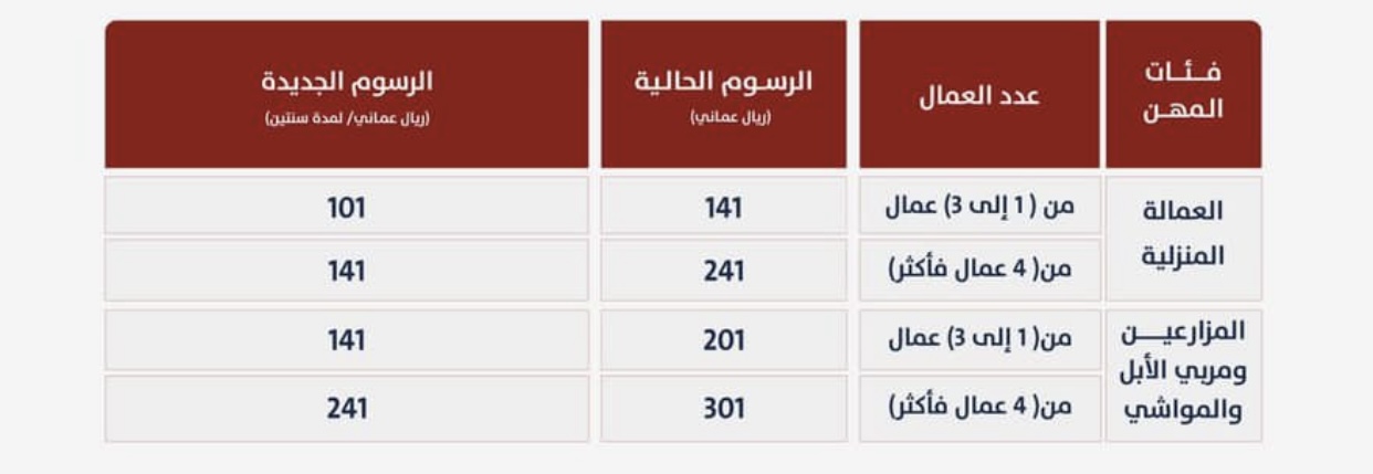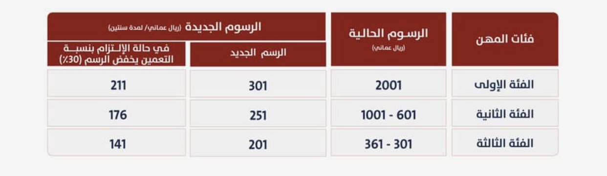 بعد توجيهات حضرة صاحب جلالة السلطان هيثم بن طارق المعظم -أبقاه الله- بخفض رسوم إصدار وتجديد تراخيص استقدام القوى العاملة غير العمانية بما ينسجم مع تطبيق دليل تسعير الخدمات الحكومية، أصدرت وزارة المالية منشورًا يوضح هذه التخفيضات وفق الآتي: