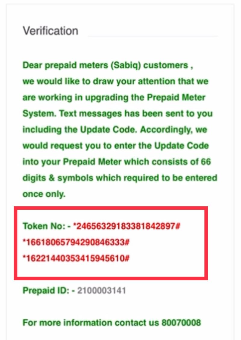 في البداية قامت شركة كهرباء مسقط بإرسال رسالة نصية لجميع المستهلكين في محافظة مسقط تحتوي على كود، وهو عبارة عن مجموعة من الأرقام، ينبغي عليك كتابتها في العداد لمرة واحدة فقط، ثم تستطيع تعبئة العداد بذات الطريقة المعتادة.