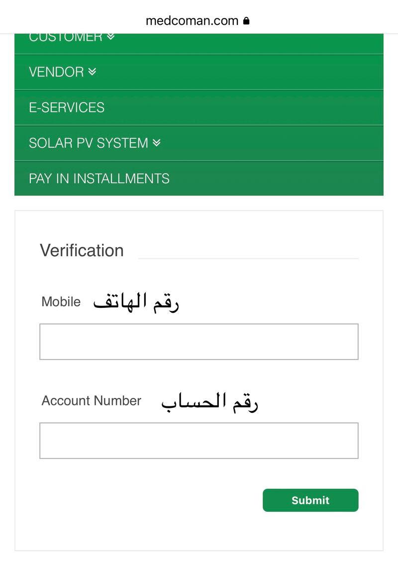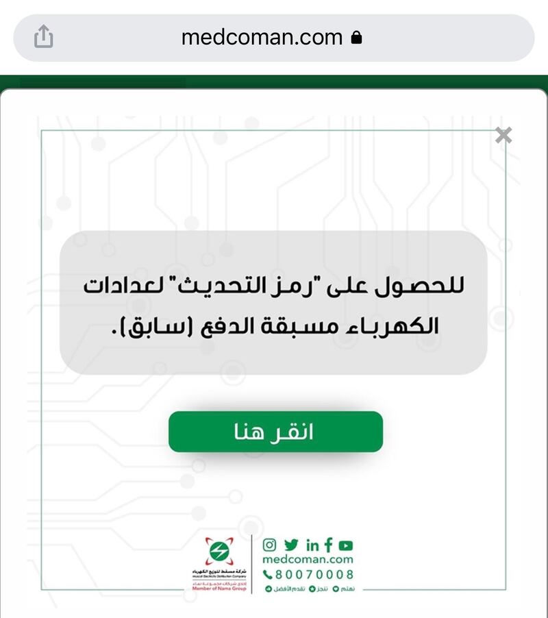 – ادخل موقع شركة مسقط لتوزيع الكهرباء WWW.MEDCOMAN.COM أو كتابة اسم الشركة في جوجل: