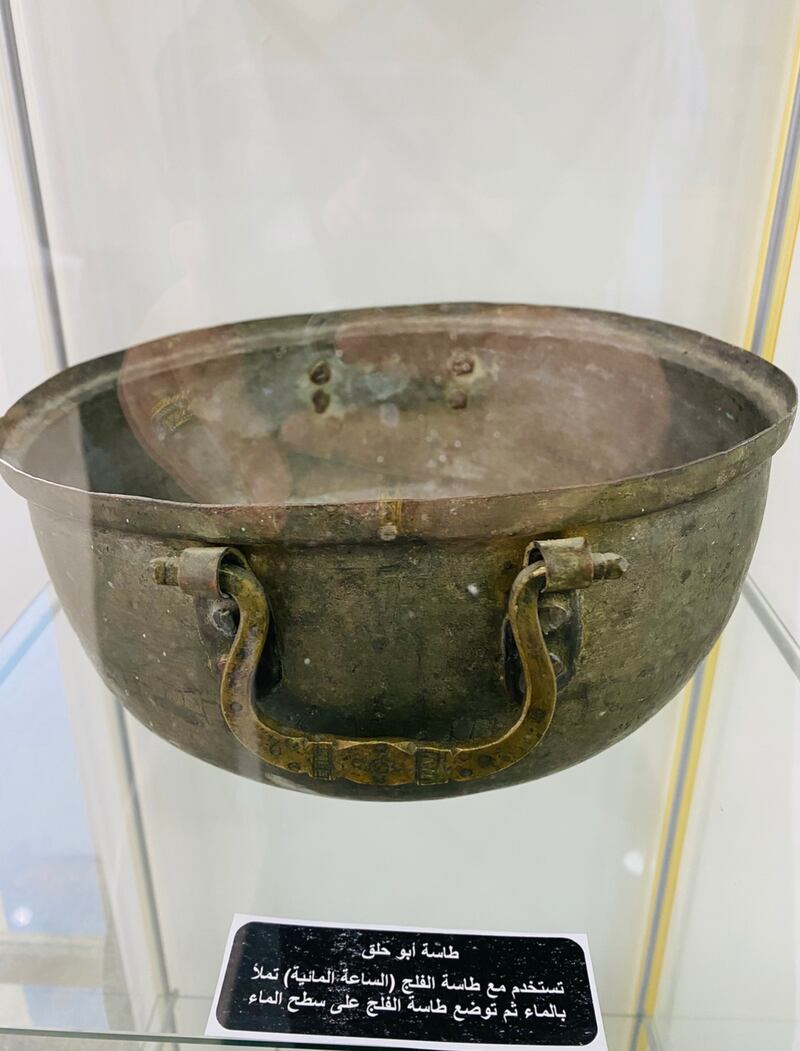 وأضاف: عند حساب الوقت (الأثر) نحتاج إلى الطاسة المائية المصنوعة من النحاس والتي بها ثقب في وسطها، وطاسة أكبر منها (طاسة أبو حلق) وهذه تملأ بالماء بأكملها، والعنصر الأخير (غطاء من السعف).