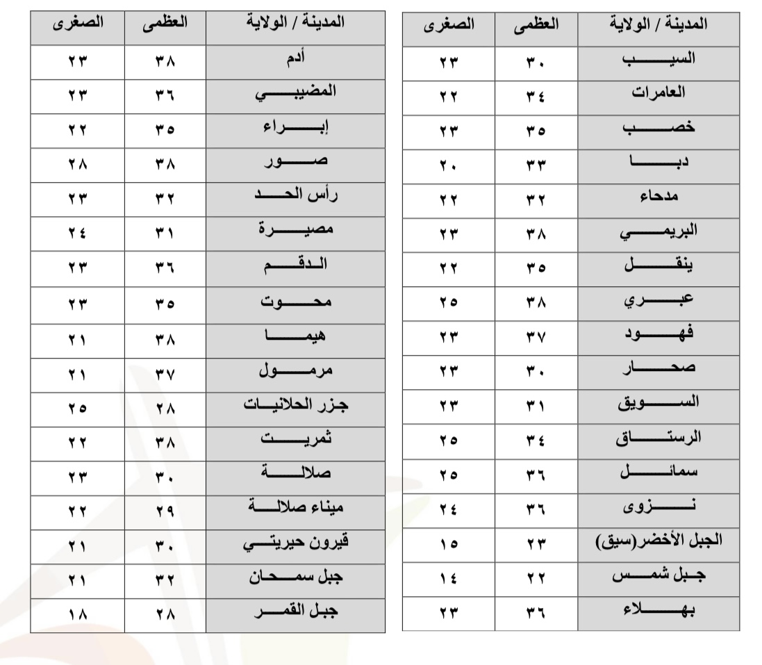 وفيما يلي درجات الحرارة في بعض ولايات ومناطق سلطنة عمان: