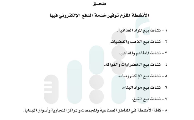 وحسب ما رصدته “أثير” من الجريدة الرسمية، فقد نصت المادة الأولى من القرار بـ ” تلتزم المؤسسات والشركات التجارية العاملة في الأنشطة الواردة في الملحق المرفق بهذا القرار بتوفير خدمة الدفع الإلكتروني لكافة المستهلكين