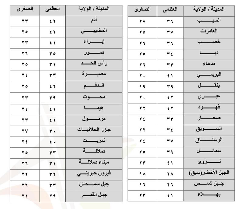 وفيما يأتي درجات الحرارة المتوقعة على بعض مناطق وولايات سلطنة عمان: