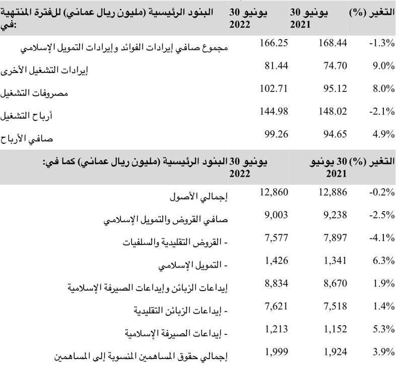 1) بلغ صافـي إيـرادات الفـوائد من الأعمال المصرفية التقليدية وإيرادات التمويل الإسلامي (166.25) مليون ريال عماني للستة أشهر المنتهية في 30 يونيو 2022م مقارنة بمبلغ (168.44) مليون ريال عماني للفترة ذاتها من العام 2021م، أي بانخفاض نسبته (%1.3) وذلك بسبب ارتفاع مصروفات الفوائد.