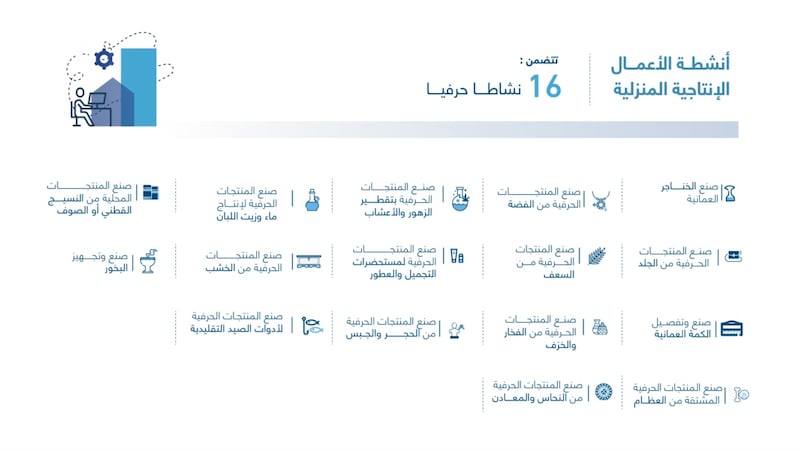 ووفق منشور تم توزيعه في المؤتمر الصحفي الذي حضرته “أثير” اليوم فقد نظّمت اللائحة مزاولة 30 نشاطًا منها 16 نشاطًا حرفيًا، وتضمنت 9 مواد بالإضافة إلى ملحق بأنشطة الأعمال المنزلية الإنتاجية.