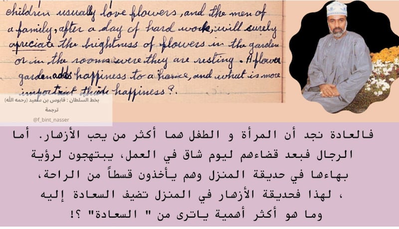وكما يبدو فإن اهتمام جلالته بالورود والأزهار يعود للصغر، وهذا الأمر تأكد لنا مؤخرا حين كشف المتحف الوطني عن جزء من مقتنيات السلطان الراحل. وكان أحد تلك المقتنيات هو دفتر تمارين مدرسي يحمل سطورا بخط جلالته لمادة تعبيرية موجزة في عدد الكلمات لكنها عميقة في معانيها. فقد كتب جلالته: