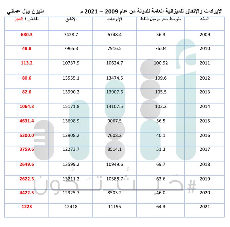 وفيما يلي تفاصيل الإيرادات والإنفاق والعجز للميزانية العمانية من عام 2009م-2021م: