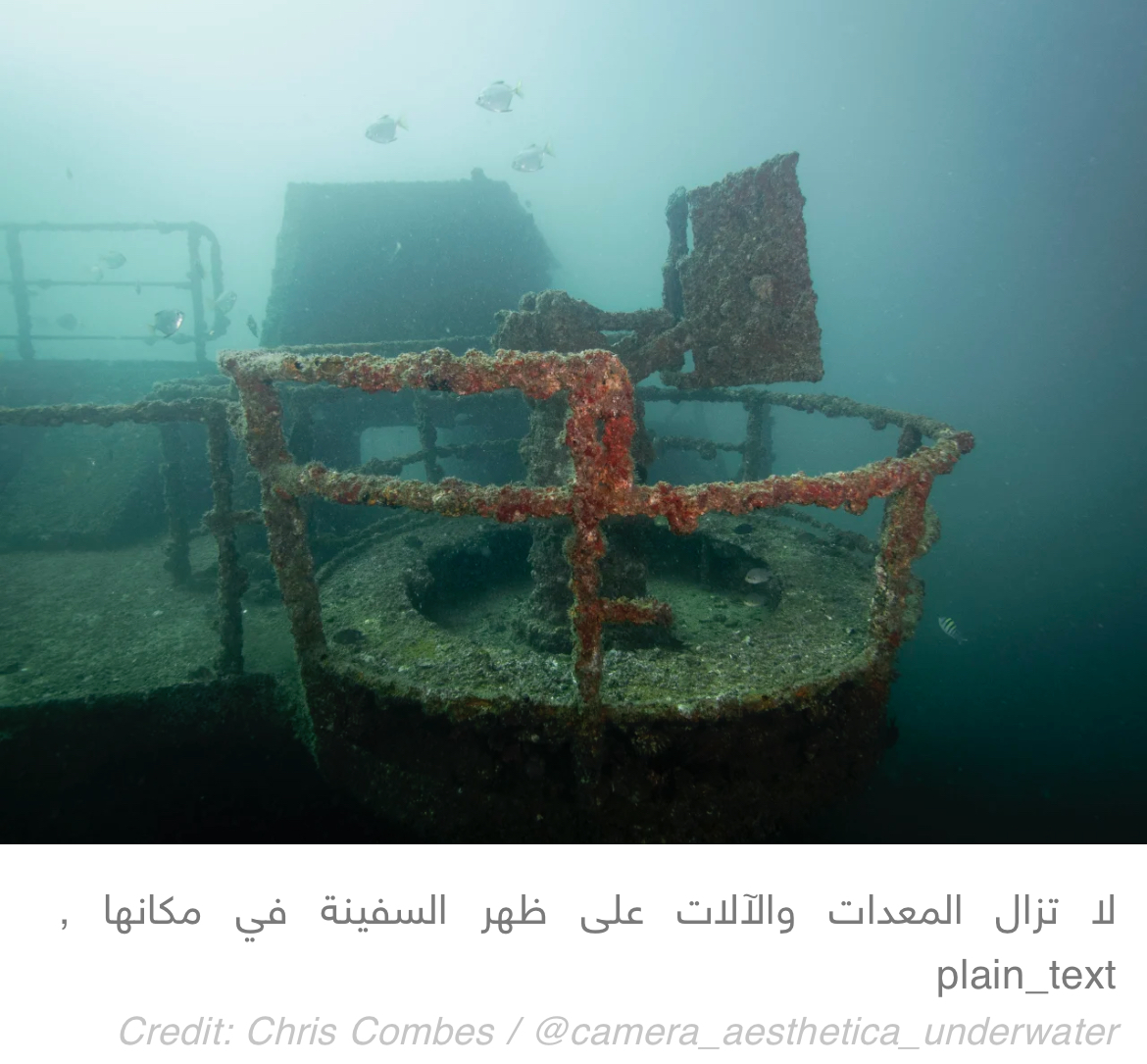 وخلال الفترة الماضية خاض أحد الغواصين المتمرسين وهو كريس كومبس تجربة استكشاف موقع حطام سفينة “المناصر”، بحسب ما ذكره لموقع CNN بالعربية، ويصف كومبس، موقع حطام السفينة الحربية الغارقة قائلًا إنه “يحوي مستويات متعددة يمكن الوصول إليها دون الدخول إلى الحطام”، مضيفًا أن “المعالم البارزة تشمل منصة البندقية وطائرة الهليكوبتر”.