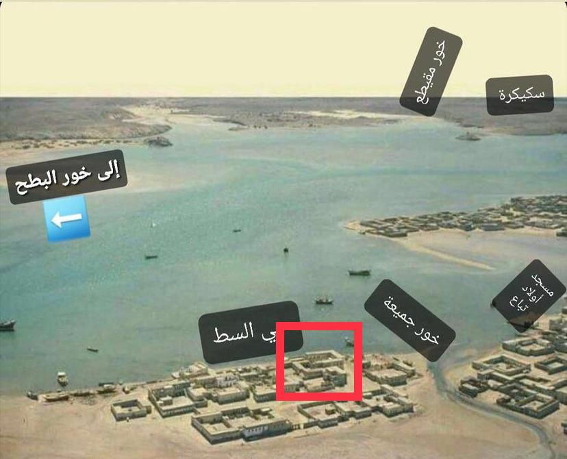 صورة توضح بيت الشيخ ناصر بن محمد ويبدو في الجزء الخلفي منه المكان الذي كان ينزل فيه السلطان سعيد