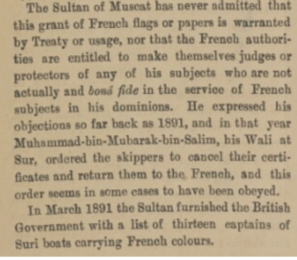 خاصة ما يتعلق بقضية رفع الأعلام الفرنسية، وهناك عدد من الوثائق والتقارير التي تشير إلى الأدوار التي قام بها، ومن بينها رسالة موجهة من قبل الشيخ محمد بن مبارك إلى السلطان فيصل بتركي بتاريخ 13 مايو 1893