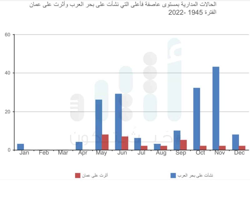 وأوضحت الإحصائية التي أعدّها البادي أن 32 حالة أثرت على سلطنة عمان منذ 1945م، حيث – يؤثر في المتوسط – حالة جوية مدارية بمستوى عاصفة فأعلى مرة كل 3 سنوات على السلطنة بشكل مباشر أو غير مباشر، فيما تعبر حالة جوية مدارية بمستوى عاصفة فأعلى الأراضي العمانية مرة كل 5 سنوات، مبينًا البادي بأن للأعاصير في عُمان موسمين؛ قبل الرياح الموسمية ( مايو ، يونيو)، وبعد الرياح الموسمية ( سبتمبر، أكتوبر ، نوفمبر )، وهذا الرسم البياني يوضح تأثيرات الحالات على سلطنة عمان في بحر العرب: