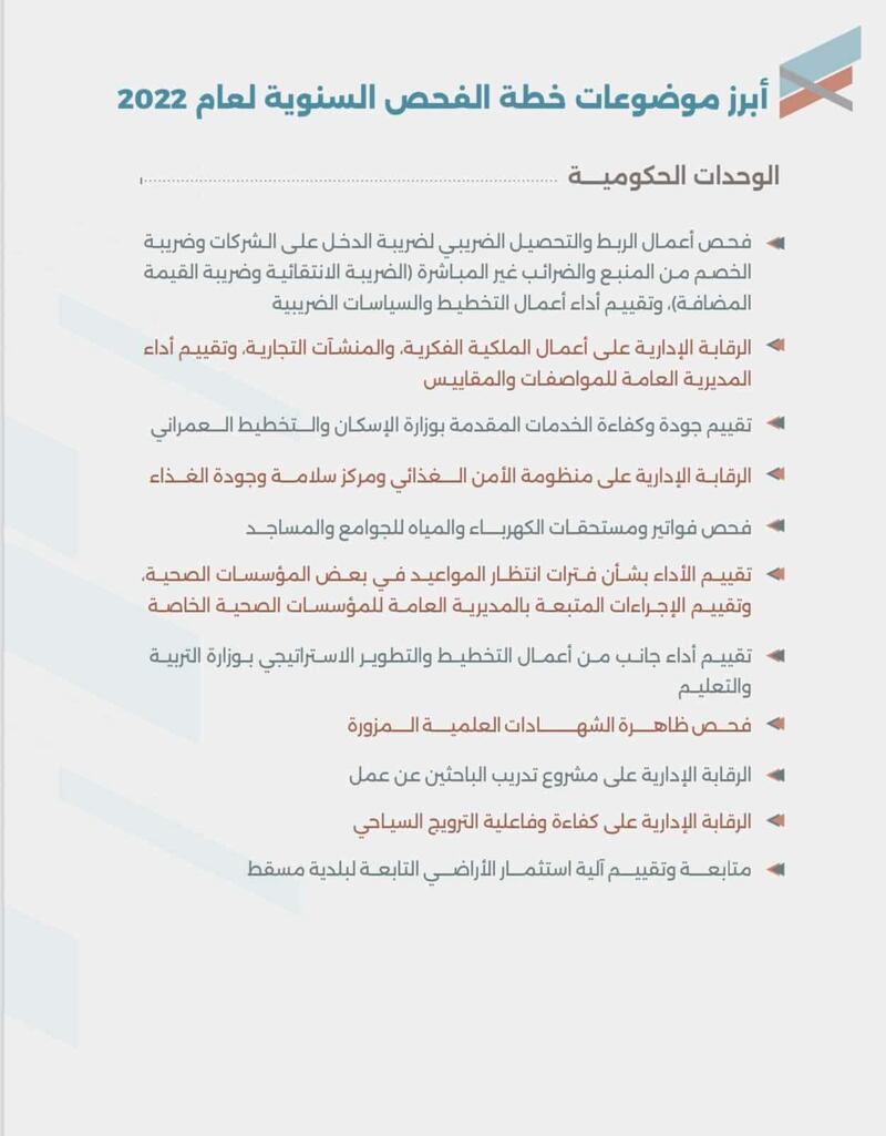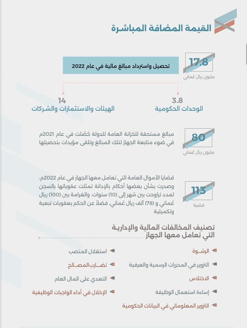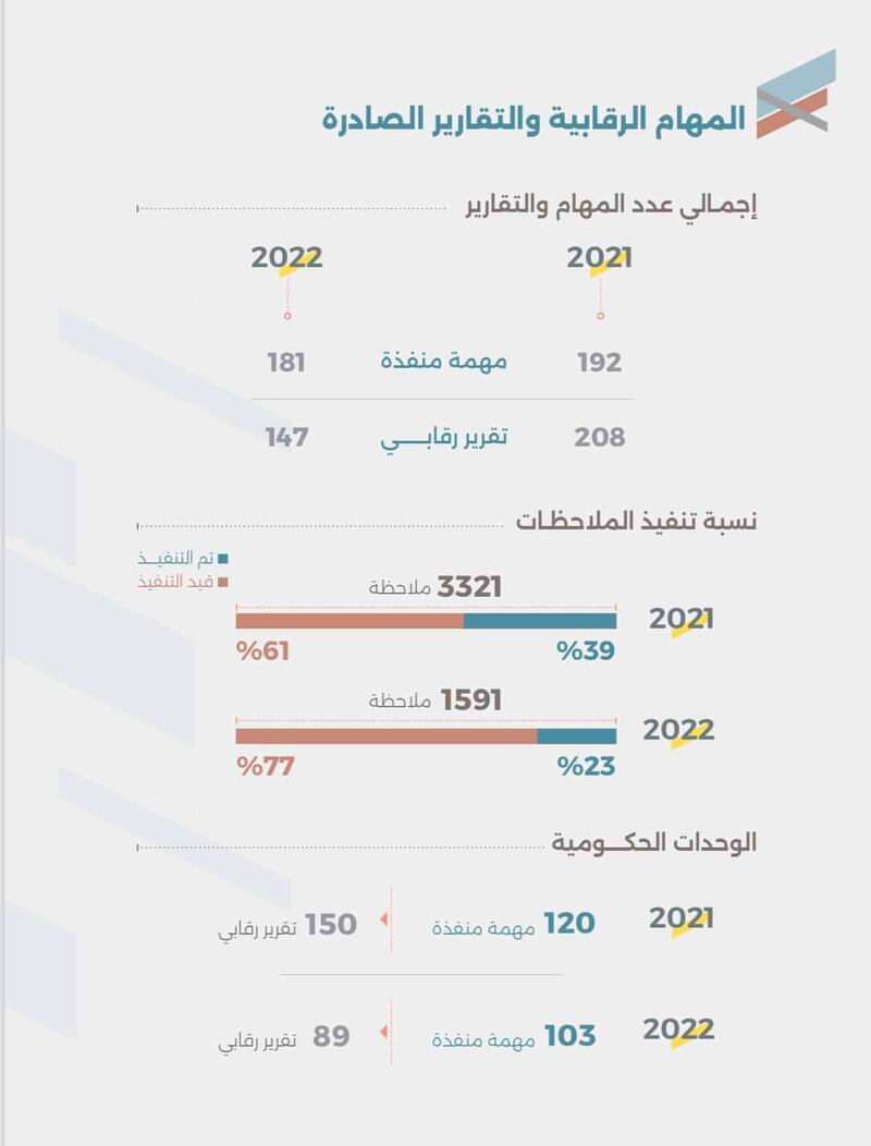 نشر جهاز الرقابة المالية والإدارية للدولة ملخص المجتمع عن التقرير السنوي للجهـاز لـعـام 2022م ،متضمنا أهم الموضوعات بخطـة الفحص السنوية والنتائج المحققة منهـا، كمـا تضمـن جهود الجهاز في الكشف عن المخالفات المالية والإدارية التي تعامل معها بالتنسيق مع الجهات المختصـة، فـضـلا عـن دوره فـي مجـال التوعيـة وتعزيز النزاهة، وإشراك المجتمع من خلال تلقي الشكاوى والبلاغات فيما يتعلق بالإهمال ومخالفة القوانين واللوائح والقرارات.