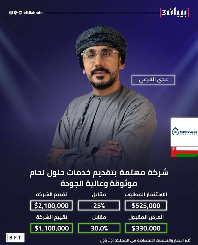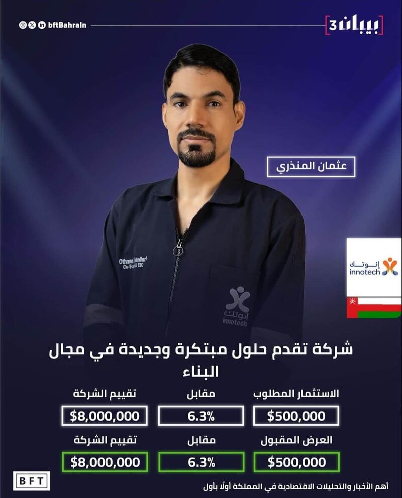 نجح كلٌ من عثمان المنذري وعدي الفرعي في جمع استثمارات بقيمة 830 ألف دولار أمريكي أي ما يعادل 320 ألف ريال عماني من لجنة مستثمري القطاع الخاص في برنامج “بيبان” البحريني في موسمه الثالث، حيث نجحت شركة “إنوتك” لرائد العمل عثمان المنذري في جمع مبلغ وقدره 500 ألف دولار، في حين جمعت شركة “سراج الأفق” والتي مثلها عدي الفرعي مبلغ وقدره 330 ألف دولار أمريكي.