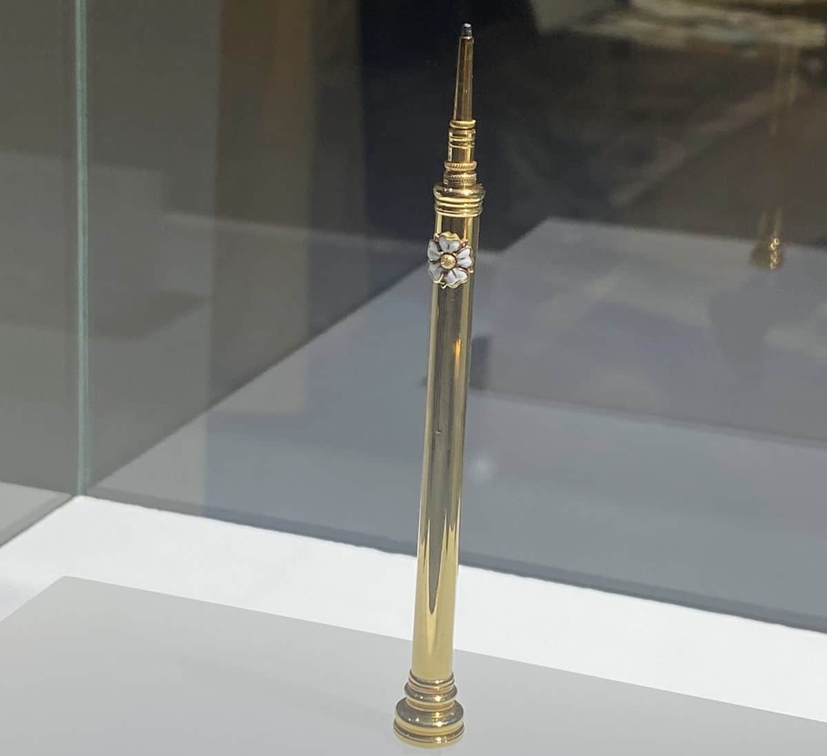 وصنع القلم من الذهب (عيار 18 قيراطا)، وحجر الدم، والمينا الأبيض، والرصاص (القلم).