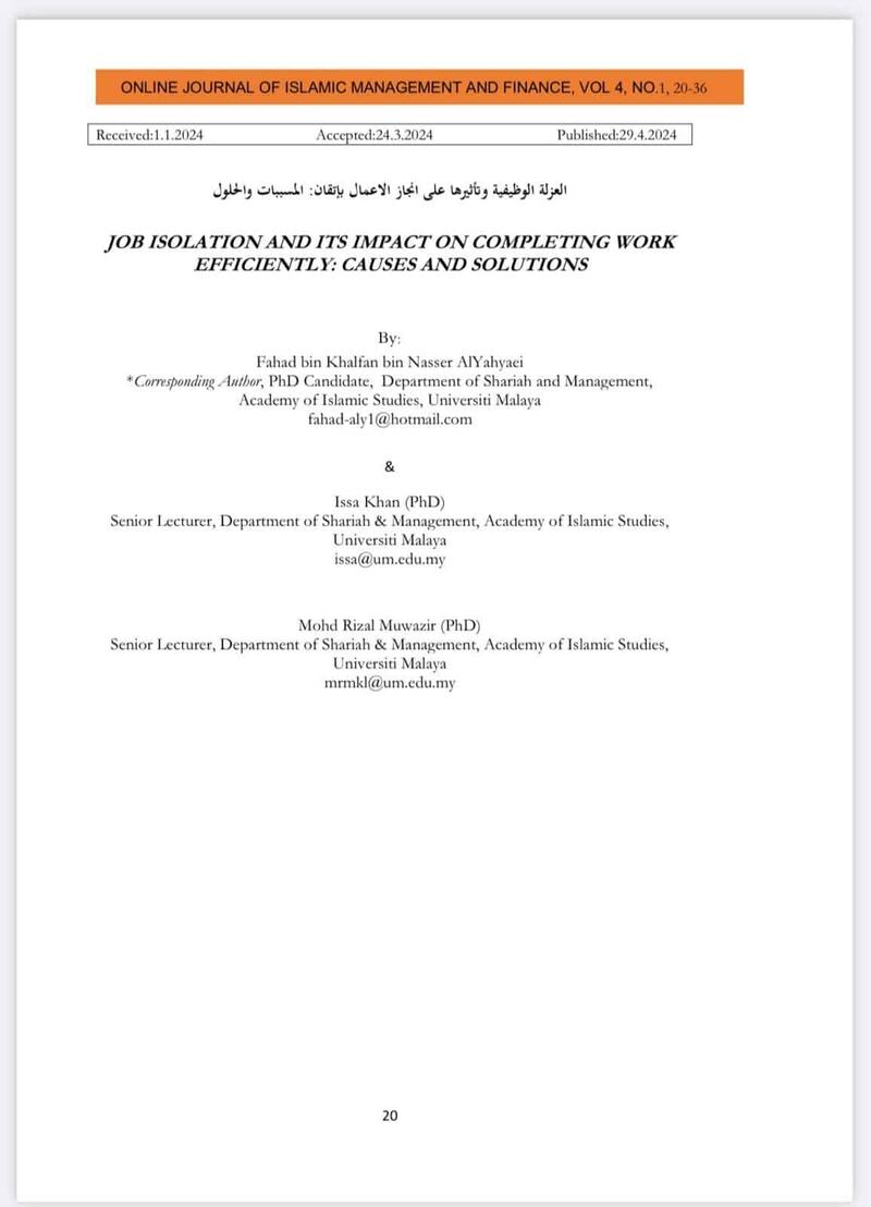 نشرت مجلة (OJIMF) ورقة بحثية للباحث العماني فهد بن خلفان اليحيائي عن نتائج الدراسة التي أجراها لقياس العزلة الوظيفية وتأثيرها على إنجاز الأعمال بإتقان: المسببات والحلول.
