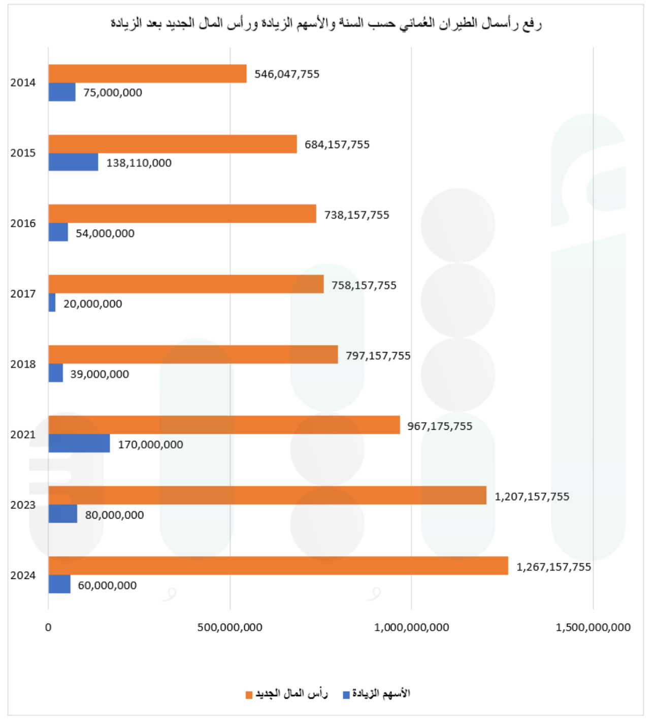 خلال الأعوام العشرة الماضية (2014-2024) تم رفع رأس مال الطيران العُماني 8 مرات، وبمقارنة بين رأس مال عام 2014 بعام 2024م، نجد أن نسبة الارتفاع بلغت 132%، إذ كان رأس مال الطيران حوالي 546 مليون ريال عُماني في عام 2014م، ووصل إلى أكثر من مليار و267 مليون ريال عُماني، أي ارتفع بحوالي 721 مليون ريال عُماني في عشر سنوات، وبنسبة ارتفاع بلغت 132%.