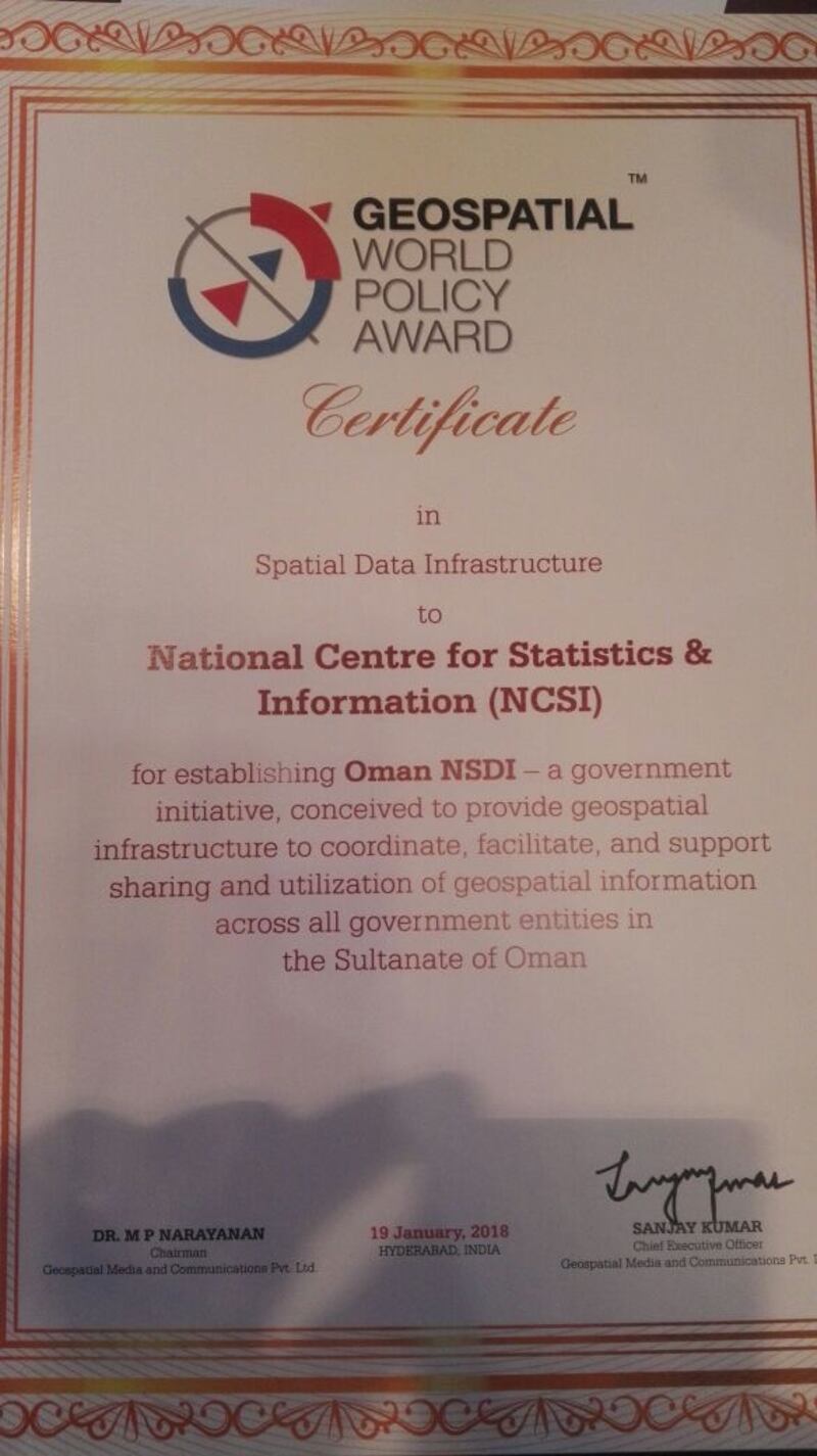 توجت السلطنة‬⁩ ممثلةً بالمركز الوطني للإحصاء والمعلومات بجائزة التميز والقيادة العالمية المكانية.