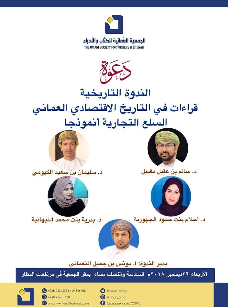 “قراءات في التاريخ الاقتصادي العماني.. السلع التجارية أنموذجا” كان عنوان الندوة التي نظمتها الجمعية العمانية للكتاب والأدباء بمشاركة عدد من الباحثين العمانيين المتخصصين في المجال التاريخي والتي أدارها الباحث يونس النعماني.