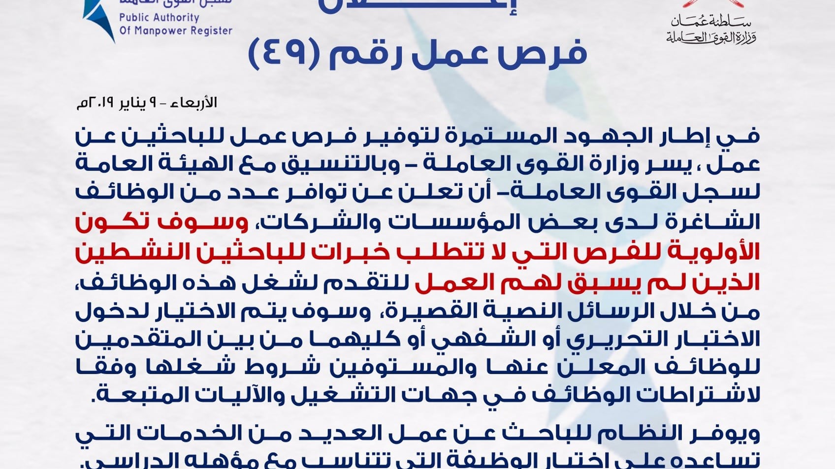 أعلنت الهيئة العامة لسجل القوى العاملة وبالتنسيق مع وزارة القوى العاملة عن ملحق فرص العمل رقم (49) الذي يحتوي على 104 فرص وظيفية.
