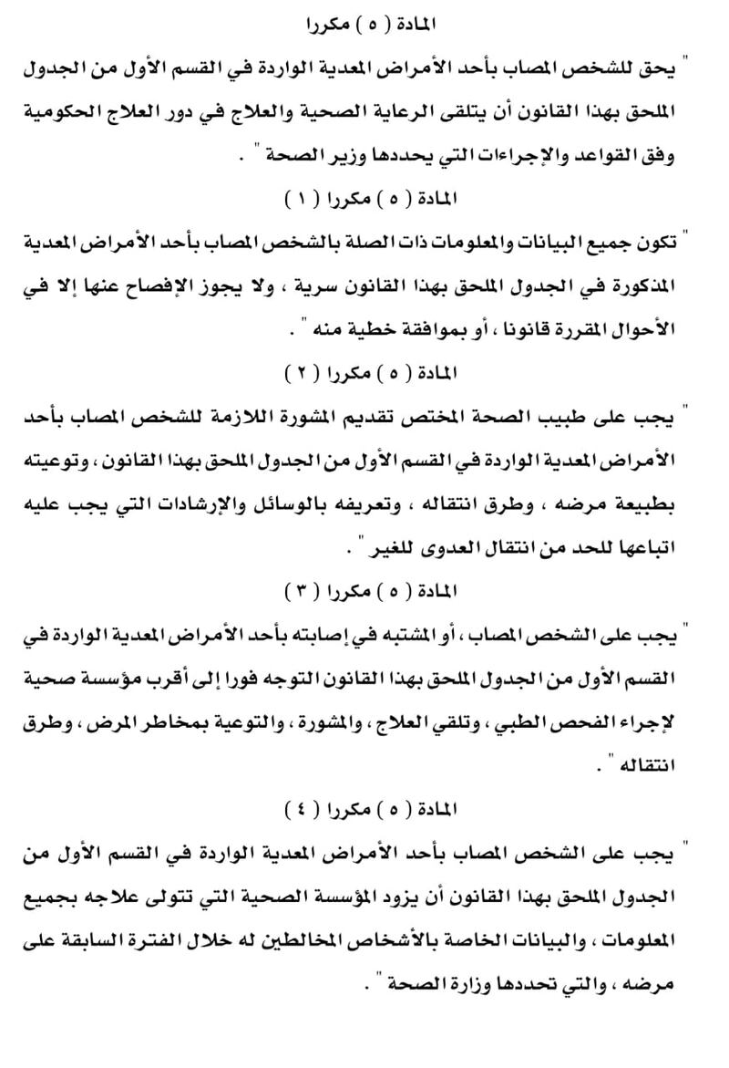 كما نصت المادة (2) بـ “يضاف إلى قانون مكافحة الأمراض المعدية المشار إليه مواد جديدة بأرقام (5) مكررا، و (5) مكررا (1)، و (5) مكررا (2)، و (5) مكررا (3)، و (5) مكررا (4)، و (5) مكررا (5)، و (5) مكررا (6)، و (5) مكررا (7)، و (5) مكررا (8) نصها الآتي:
