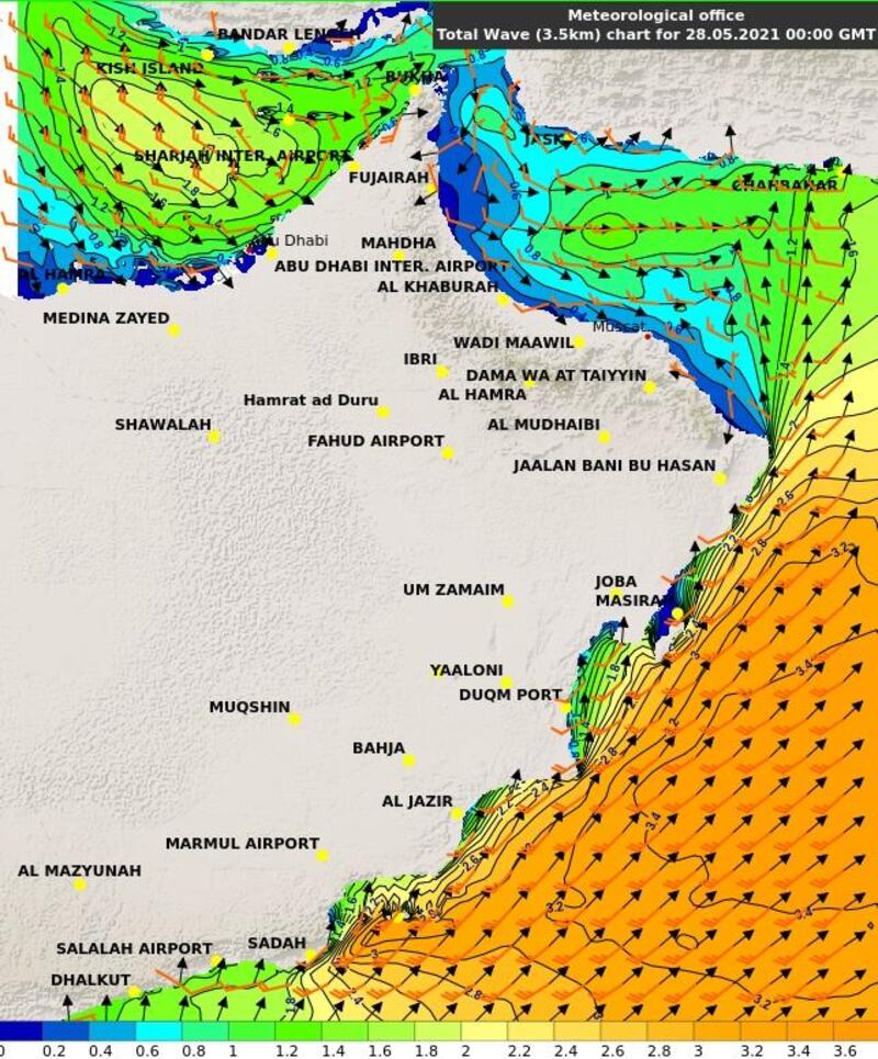 كذلك، أفادت الأرصاد العمانية باستمرار هيجان بحر العرب ليصل أقصى ارتفاع له بين (3.0-3.5) متر وتوقعات بارتفاع موج البحر على سواحل مسندم وبحر عمان إلى متوسط الموج ليصل أقصى ارتفاع لهما بين (2.0-2.5) متر ابتداء من الغد وحتى الجمعة، داعية إلى الانتباه وأخذ الحيطة والحذر لمرتادي البحر والصيادين.