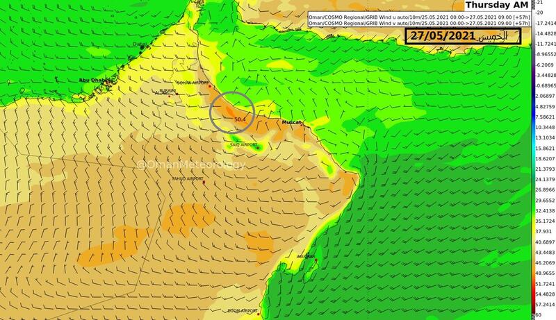 كما نبّهت الأرصاد من هبوب رياح جنوبية نشطة على محافظة الوسطى واحتمال تأثيرها على محافظات البريمي والظاهرة وشمال وجنوب الباطنة وأجزاء من الداخلية مما قد يؤدي الى تطاير الغبار والأتربة يصاحبها ارتفاع في درجات الحرارة تصل بين (46-48) درجة مئوية على سهول وسواحل شمال وجنوب الباطنة خلال الظهيرة.