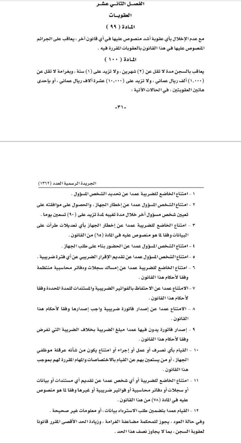 وقال الجهاز في تنبيهه بأنه يتوجب على جميع الخاضعين المسجلين لدى جهاز الضرائب تقديم الإقرارات في المواعيد المحددة في القانون وفق القرارات واللوائح الصادرة بهذا الأساس ووفقا لقانون ضريبة القيمة المضافة الصادر بالمرسوم السلطاني رقم 121 /2020.