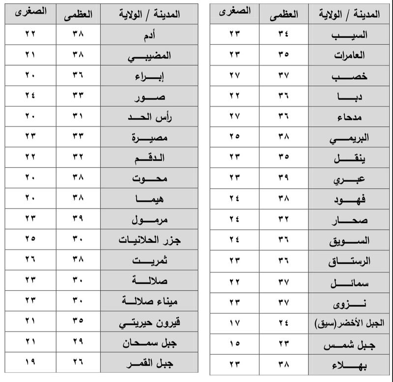 وفيما يلي درجات الحرارة العظمى والصغرى المتوقعة في بعض ولايات السلطنة: