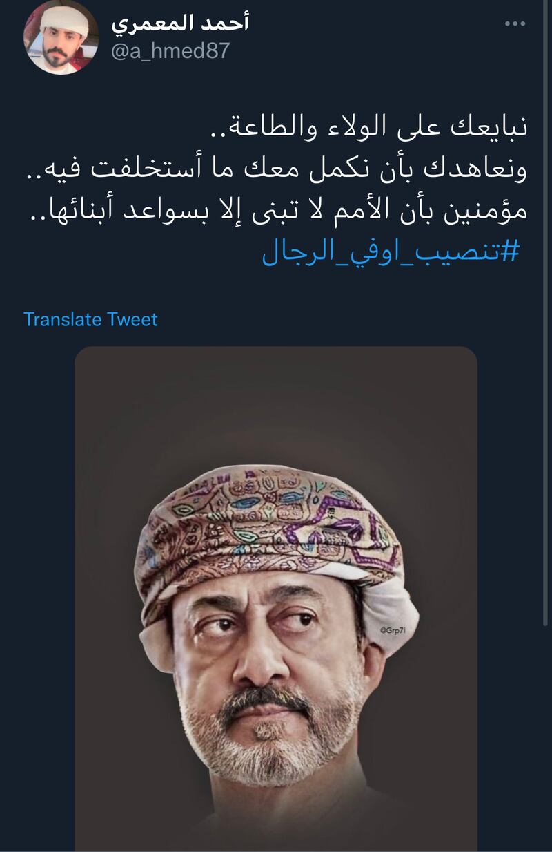 محسن العبري اقتبس في تغريدته ما ذكر في وصية السلطان الراحل قابوس بن سعيد -طيب الله ثراه- وهي: “وذلك لما توسمنا فيه من صفاتٍ وقدراتٍ تُؤهله لحمل هذه الأمانة” حفظ الله جلالة ⁧‫#السلطان_هيثم_بن_طارق‬⁩