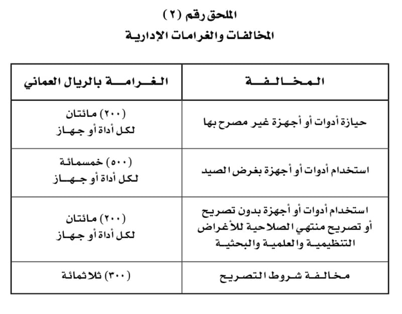 مع عدم الإخلال بأي عقوبة أشد ينص عليها في قانون حماية البيئة ومكافحة التلوث، وقانون المحميات الطبيعية وصون الأحياء الفطرية، المشار إليهما، أو أي قانون آخر، تفرض غرامة إدارية على كل من يخالف أحكام هذا القرار على النحو المحدد في هذا الملحق