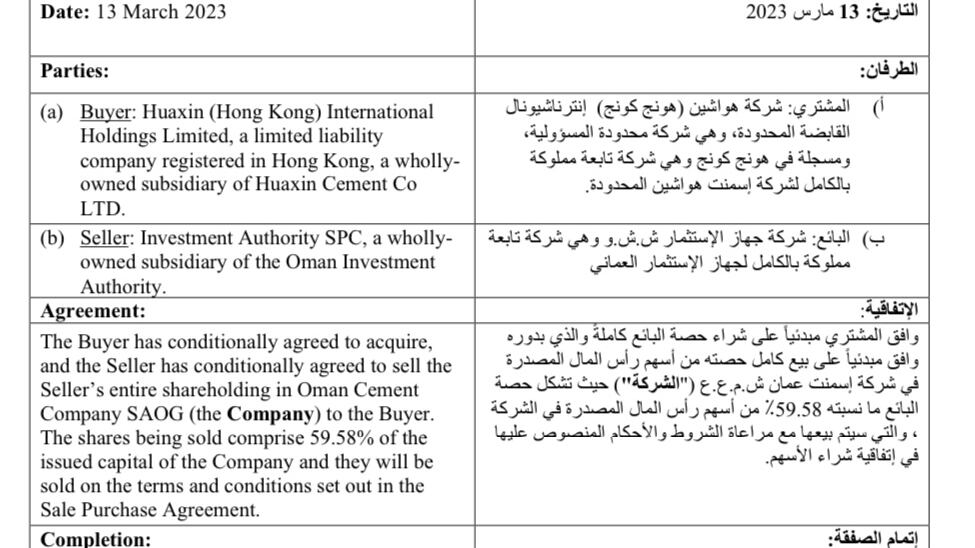وقالت الشركة بأنها تلقت إخطارا من جهاز الاستثمار العماني بإبرام اتفاقية شراء الأسهم مع شركة هواشين (هونج كونج) إنترناشيونال القابضة المحدودة، وهي شركة محدودة المسؤولية، ومسجلة في هونج كونج وتابعة ومملوكة بالكامل لشركة إسمنت هواشين المحدودة، لبيع كامل أسهم جهاز الاستثمار العماني البالغة نسبتها 59.58 ٪ من رأسمال في الشركة المصدر.