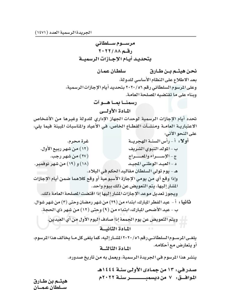 ووفقًا للحسابات الفلكية أعلاه، والمرسوم السلطاني رقم 2022/88 القاضي بتحديد أيام الإجازات الرسمية، فإن رأس السنة الهجرية الذي يوافق غرة شهر محرم من كل عام يعد إجازة رسمية للقطاعين العام والخاص بمناسبة ذكرى الهجرية النبوية الشريفة على صاحبها أفضل الصلاة وأزكى السلام.