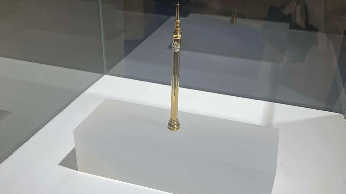 وصنع القلم من الذهب (عيار 18 قيراطا)، وحجر الدم، والمينا الأبيض، والرصاص (القلم).